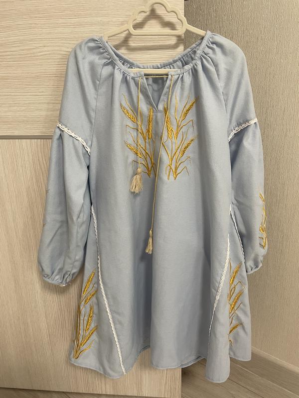 Продам вишиту сукню, стан нової. Ніжно блакитного кольору з вишитими колосками та мереживом, до низу йде трапецією, можна носити з поясом або без, він іде в комплекті. Рукав бохо. Це найгарніша вишита сукня, яка в нас була. Довжина 69 см, півобхват грудей 41 см, до низу вільна трапеція. Рукав від горловини 51 см