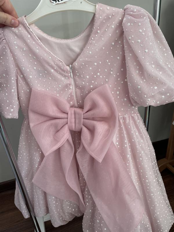 Дуже гарне плаття на дівчинку 3-4 роки, одягали 2 рази. Нюанс є зашита дірочка знизу, але непомітна ( фото додала) Бант відʼєднується Ширина по поясу 29 см, довжина 55 см.