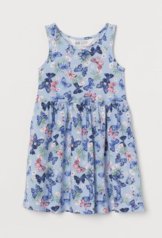 Летнее трикотажное платье H&M, отрезное по талии, голубое в бабочке. Размеры 110-116, 122-128,