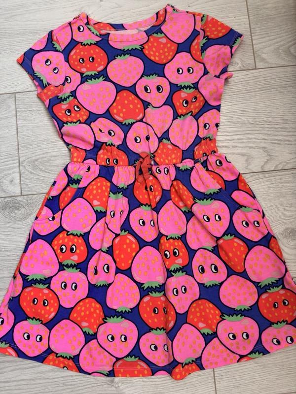 Яскрава літня сукня на дівчинку 6 — 7 років, трикотаж. Стан ідеальний. На спідничці є кишені. На талії резину вка. Орієнтуєтесь по замірах: пів обхват грудей 35, пів обхват талії 28, довжина спіднички від талії 36, довжина від шиїної точки плеча до талії 31, довжина посередині полочки до лінії талії 26. Придбана в Італії, фірма Spotted zebra.