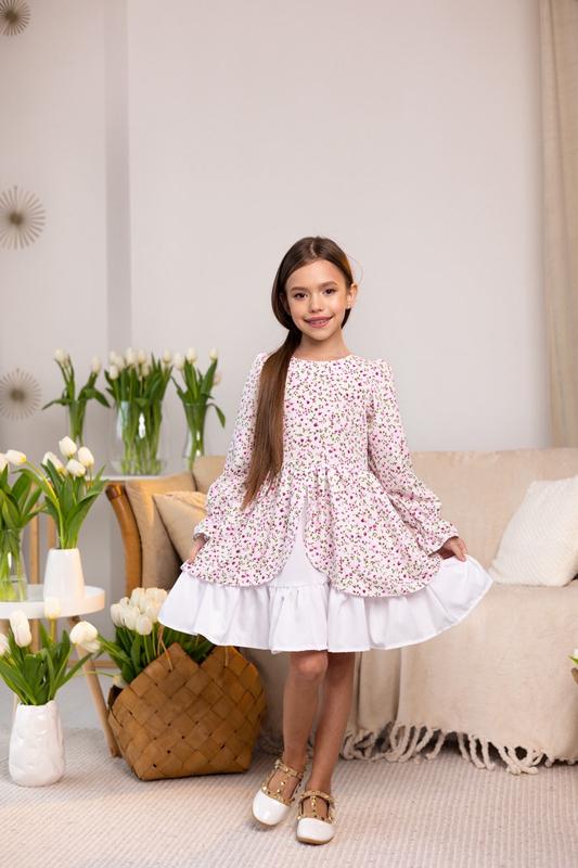 Ніжна сукня з квітковим принтом для дівчинки Ця вишукана сукня з квітковим принтом — ідеальний вибір для урочистих подій, фотосесій або просто особливих моментів. Верх виконаний із легкої тканини з дрібними рожевими квітами, а низ прикрашений білою широкою оборкою, що додає образу легкості та ніжності. Деталі: • Розміри: 116, 122, 128, 134, 140 • Колір: білий із рожево-зеленим квітковим принтом • Довгі рукави з еластичними манжетами • Комфортний вільний крій • Матеріал: приємний до тіла, не подразнює шкіру • Чудово підходить для свят, вечірок чи прогулянок З такою сукнею ваша маленька модниця буде в центрі уваги!