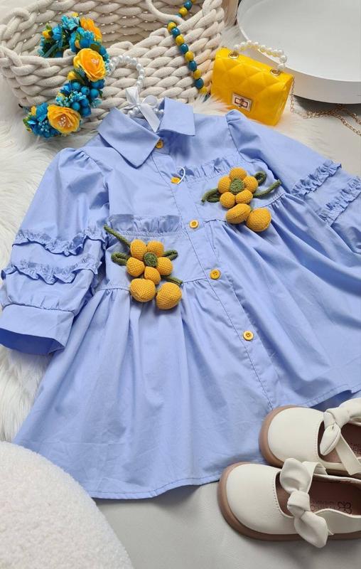 Неймовірна стильна сукня-сорочка. Рубашечна тканина (бавовняна), не просвічується. Дуже стильні квітки і в добовнення до них жовті гудзики. ЗАМІРИ Рукав від плеча Довжина вказана по коротшій частині. 100 - довжина 50 ширина 31 рукав 33 110 - довжина 55 ширина 32 рукав 36 120 - довжина 58 ширина 34 рукав 38 130 - довжина 63 ширина 36 рукав 42 140 - довжина 68 ширина 38 рукав 45