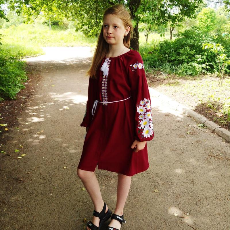 Детское вышитое платье на бордовом льне.