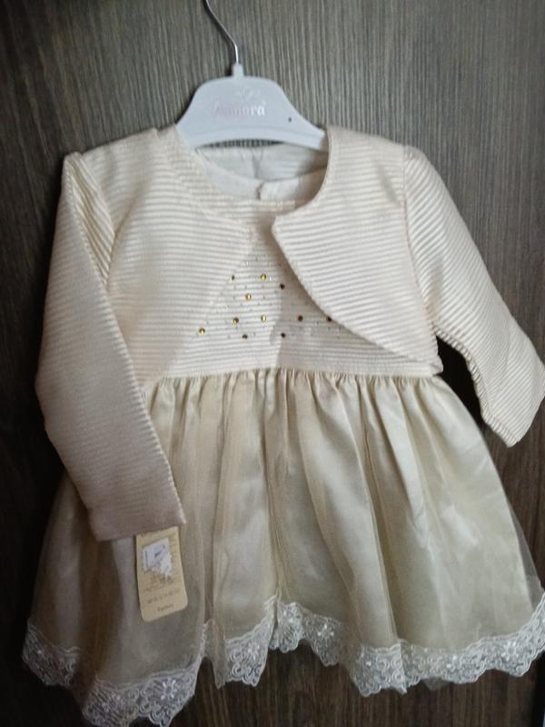 Новое платье для принцессы на возраст 1 год,на короткий рукав, с болеро. Производитель Турция. Длина по спинке от горловины 47 см,ширина в поясе 26 см, длина рукава болеро от плеча 28 см