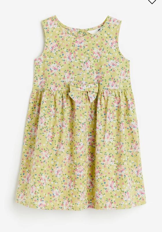 Платье с принтом из хлопковой ткани. Модель без рукавов с небольшим V-образным вырезом на затылке и застежкой на пуговицы сзади. Вырезанный на талии с декоративным бантом спереди. Без подкладки. Новая без бирки.