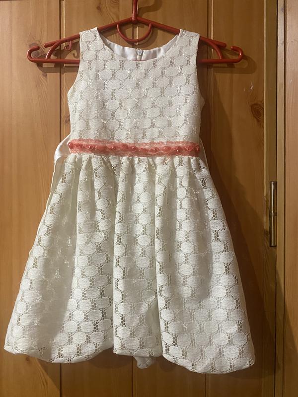 Дитяча святкова сукня Продам ніжну святкову сукню для дівчинки. Молочного кольору, оздоблена мереживом, зі спідницею на підкладці. На талії — декоративний рожевий пояс з квіточками. Дуже гарно виглядає на фото та в реальності. Підійде для свят, весіль, фотосесій, днів народжень. Розмір: 110 Стан: відмінний, не враховуючи дефект на 3 фото. Пишіть, відповім на всі запитання!