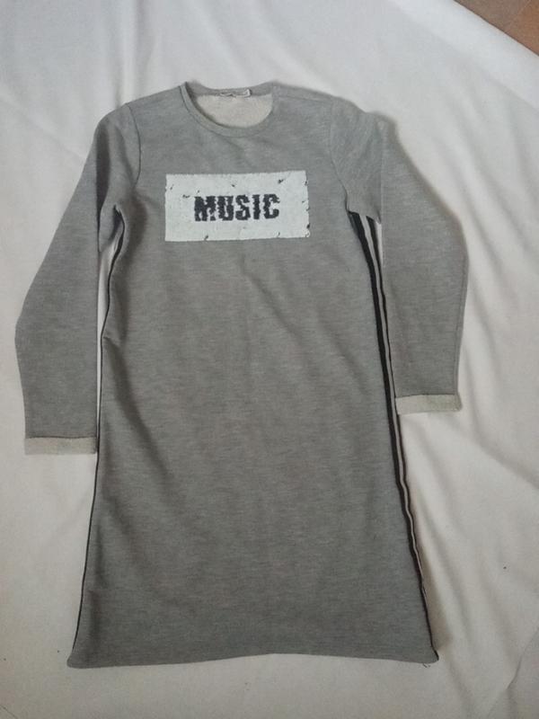 Стильное платье для девочки подростка.Вик указан 11-12роков.Ткань трехнитка.На последнем фото видно как пробка есть нить в ткани, платье все с этой блестящей ниточкой. Из переда есть пайетки, изменяющиеся при их перемещении вверх-вниз. Длина от плеча 77см. от плеча до плеча 31см от подмышки до подмышки 40см рукав 50см