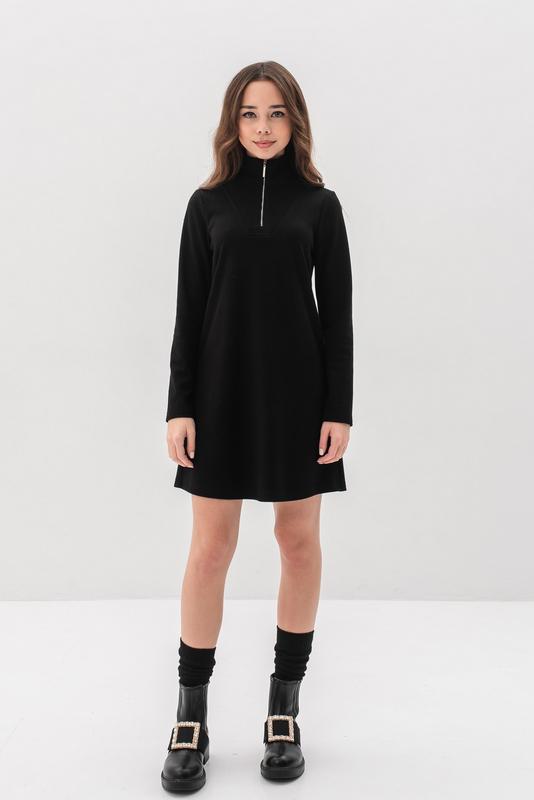 Платье трапецивидного силуэта, полуприлегающее, с втачным одношовным рукавом. Воротник стойка. Передняя половинка украшена кокеткой из основной ткани. Застежка на замок, который переходит из воротника на кокетку.