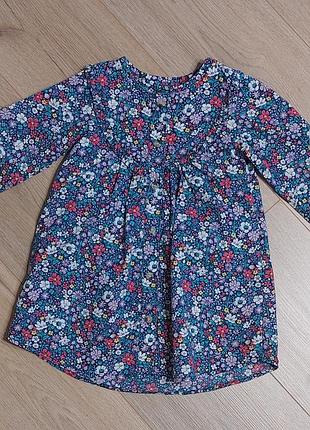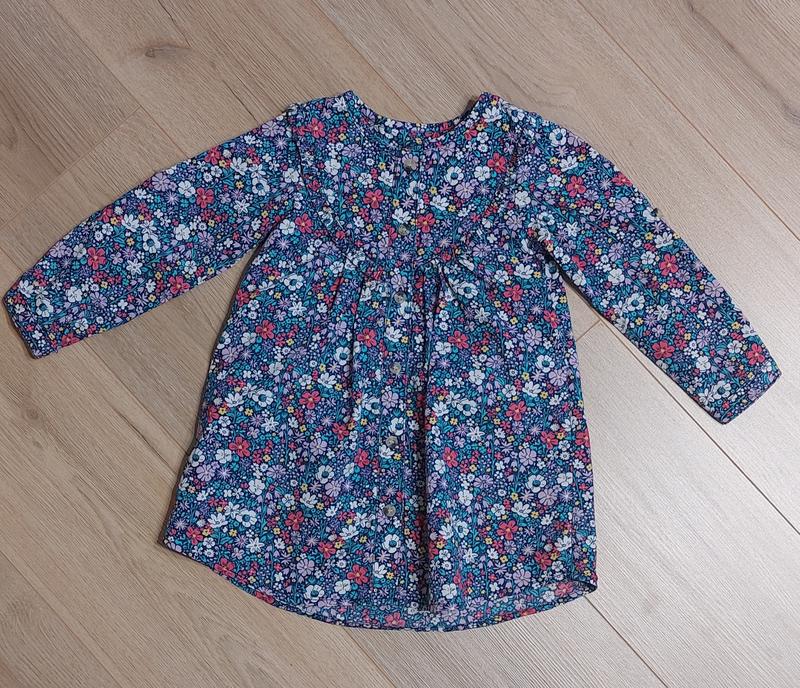 Красивое цветочное платье. Прикрашена рюшами . По всей длине пуговицы и есть боковые карманы. Рукавчик можно делать короткий. Состояние отлично. Размер указан 92- 98 Замеры длина 49 см ширина под руками 30 см расширение к низу 45 см рукав от горловины 39,5 см