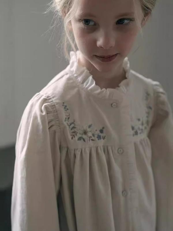 Ніжна дитяча сукня для дівчинки від Louisiella виконана з м'якого мікровельвету світло-бежевого відтінку. Сукня має прямий силует, довгі рукави з невеликими оборками на манжетах та витончений комір-стійку з рюшами. Довжина за коліно. Спереду сукня застібається на ряд невеликих світлих ґудзиків, що проходять по всій довжині до низу. Кокетка сукні прикрашена вишуканою квітковою вишивкою з блакитними, коричневими та кремовими елементами, розташованими симетрично з обох боків від застібки. Лінія кокетки підкреслена невеликими зборками, що надають сукні легкості та об'єму. Нижній край сукні також оздоблений невеликою оборкою, що гармонійно доповнює дизайн рукавів та коміра. Для додаткового комфорту та ніжності до шкіри дитини, сукня має підкладку зі 100% бавовни. Ця сукня виглядає дуже мило та елегантно. Вона чудово підійде для особливих випадків або для створення ніжного повсякденного образу.