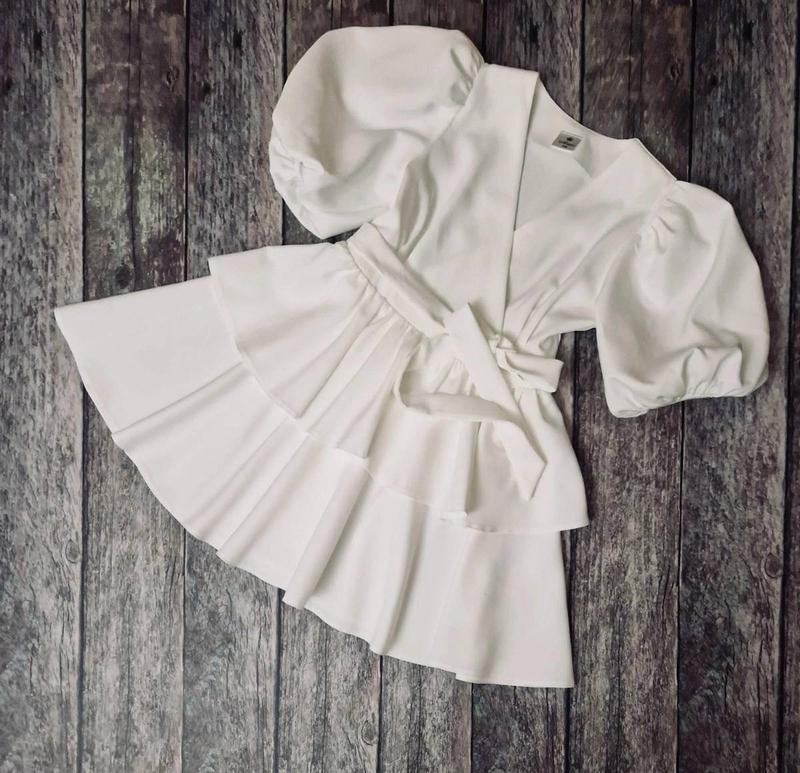Сукня на запах Поясок в комплекті. Тканина - костюмна. Заміри: 140 довжина - 67см, напівобхват грудей - 38см, пояс - 32см. 158 довжина - 80см, напівобхват грудей - 45см, пояс - 39см.