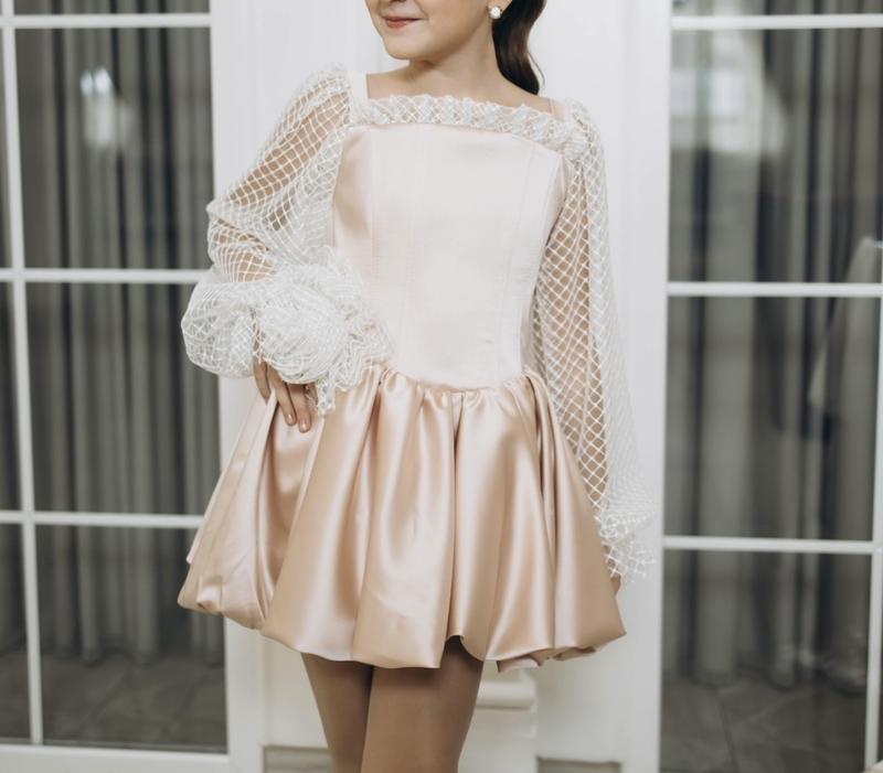 Сучасне , стильне , святкове плаття пошите на замовлення в ексклюзивному дизайні. Колір пудровий , гарні рукава з сітки . Одягнуте один раз на свято