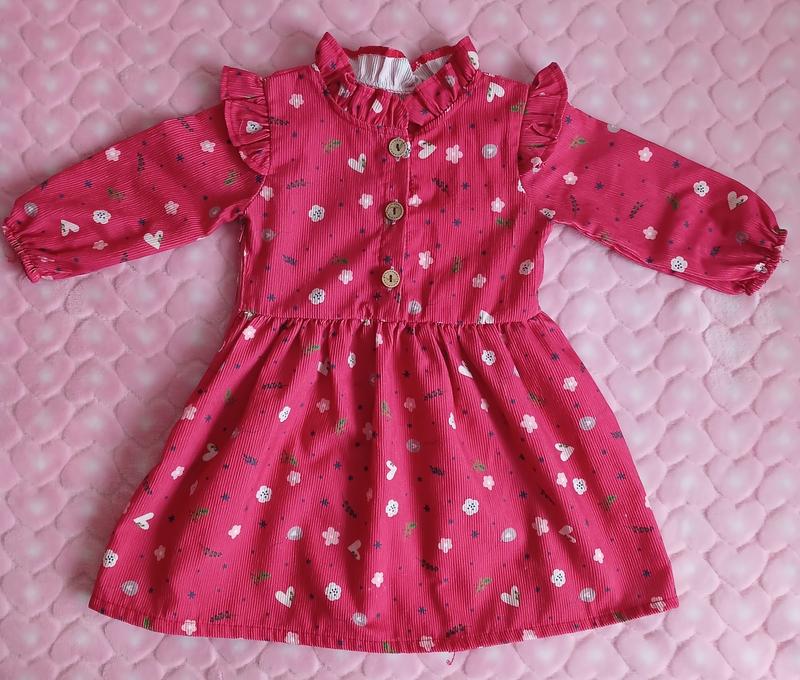 Платье праздничное, можно и на каждый день. Длина 48, рукав 27, сбоку застегивается на молнию, рукав на резинке, спереди застегивается на пуговицах. Размер 18 мес. Ткань микровельвет.