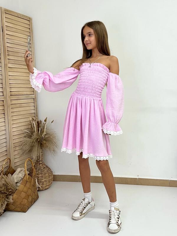 Праздничное красивое платье Верхняя часть платья собрана, красиво тянется ткань турецкий муслин прикрашена бавовняним мереживом Супер качество Рост/длина от груди/пог/рукав Похибка +-2см 134/61/20/40-1шт 140/64/21/41-1шт 158/69/45/44-1шт 164/70/27/45-1шт