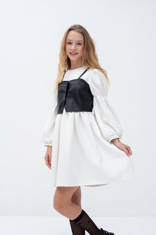 Тканина- костюмна, топ - екошкіра. Заміри: 140 довжина - 72см, рукав від горловини - 55см, напівобхват грудей - 34см 146 довжина - 76см, рукав від горловини - 59см, напівобхват грудей - 37см 152 довжина - 82см, рукав від горловини - 64см, напівобхват грудей - 39см 158 довжина - 86см, рукав від горловини - 66см, напівобхват грудей - 41см