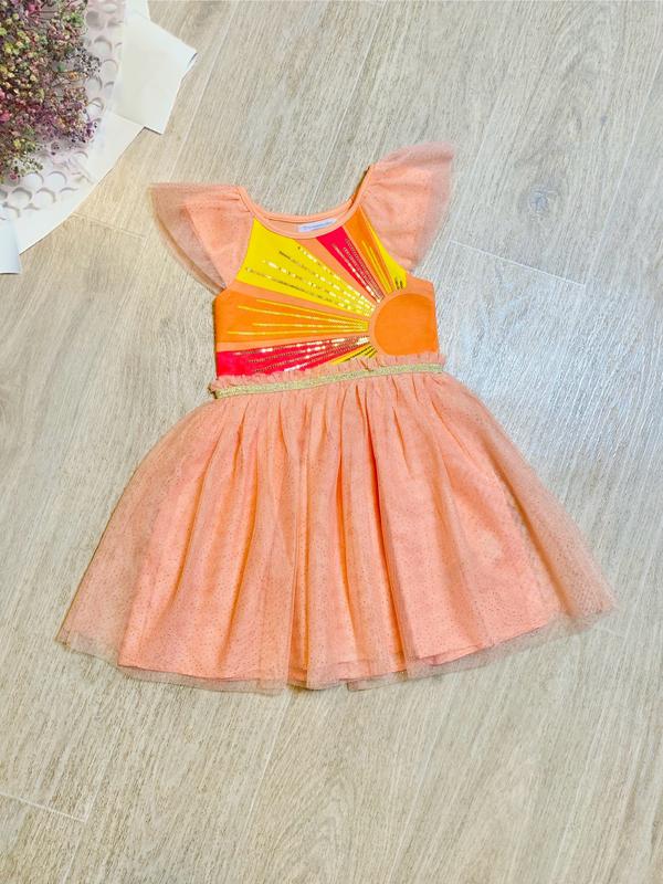 Святкова сукня для дівчинки 104 см від бренду Primark. Має фатінову спідницю та фатінові вставки на рукавах. З переду промінчики сонечка обшиті пайєдками (лелітками). Доставка в межах міста Одеса безкоштовно на замовлення від 300 грн.