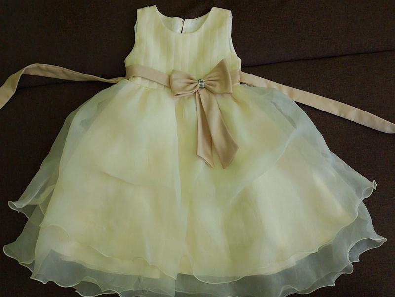 Нарядное платье на 6-7 лет. Указан рост 130 см. Цвет светло-желтый, золотистый, молочный, бант - золотистый. Надевали два раза.Юбка имеет 4 слоя: подкладка, атлас и 2 слоя органзы. Застегивается сзади на молнию. Длина - 74 см. ПОГ - 32 см. Дефекты: повреждения по подолу (коты), на фото показала.