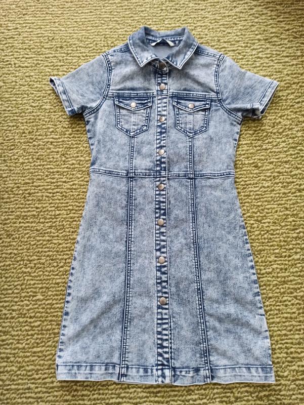 джинсовое платье на кнопках из мягкого вываренного денима на рост 134-140, очень красиво садится по фигуре, на кнопках есть легкая потертость, отличное качество, состояние идеально