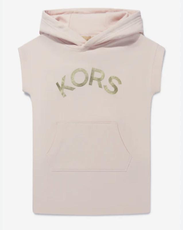 Розовое платье с логотипом для девочек от Michael Kors Kids. Изготовлено из мягкого хлопка средней плотности. Спереди напечатан логотип бренда в блестящем золотом цвете, есть карманы-кенгуру и капюшон. на 5-6 лет