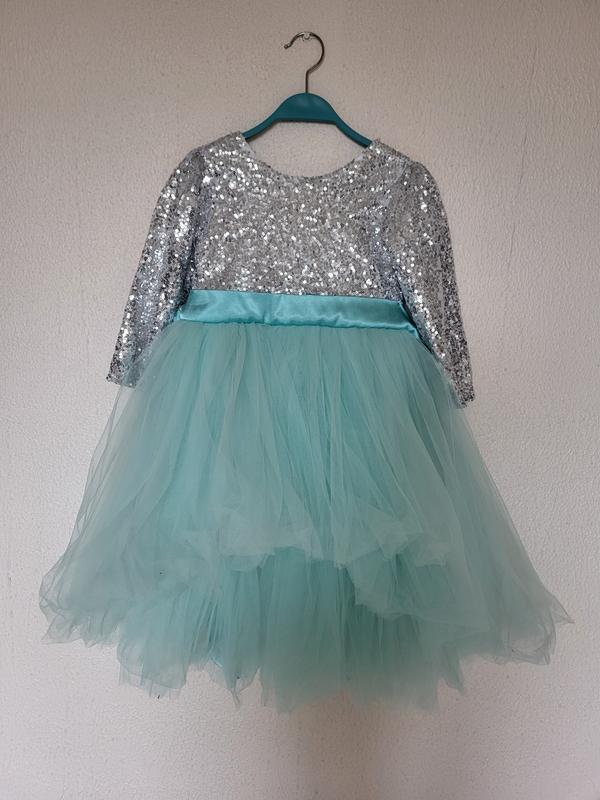 Святкова сукня для дівчинки. Розмір не вказано, тому що шили на замовлення. Стан відмінний Заміри Ширина під руками 30 см, в поясі 31 см (можна регулювати за рахунок поясу, який ззаду зав'язується) Плечі 28.5 см, рукав 32,5 см Сукня ззаду подовжена ( довжина перед - 55 см, по спинці - 74 см)