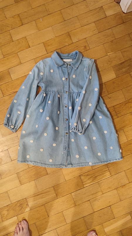 Красивое платье из денима с объемным пушистым горохом на весну или прохладную летнюю погоду.Застегивается спереди на пуговицы, Общая длина -56,5см Ругав-40см Полу обхват груди -31,5см