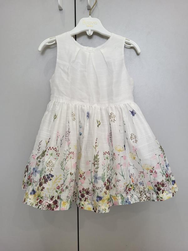 Красиве легеньке святкове платтячко для дівчинки на 2-3 рочки молочного кольору з квітковим принтом. Ззаду має потаємну блискавку.