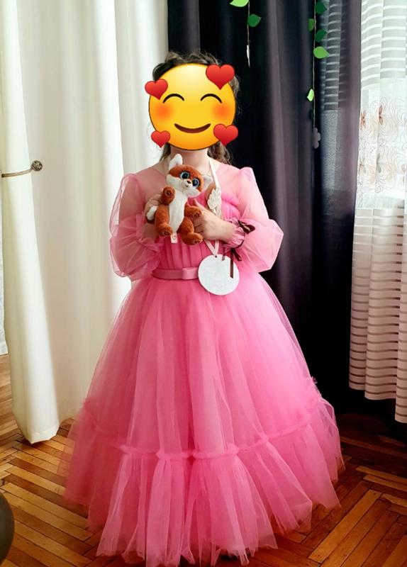 Платье невероятно красивое, яркое, эффектное. Цвет розовый, очень свежий. Одетая на 2 часа на выпускной, так что состояние новой. Рост ребенка на фото 122 см, можно до 134 см надевать. Ширина регулируется шнуровкой.