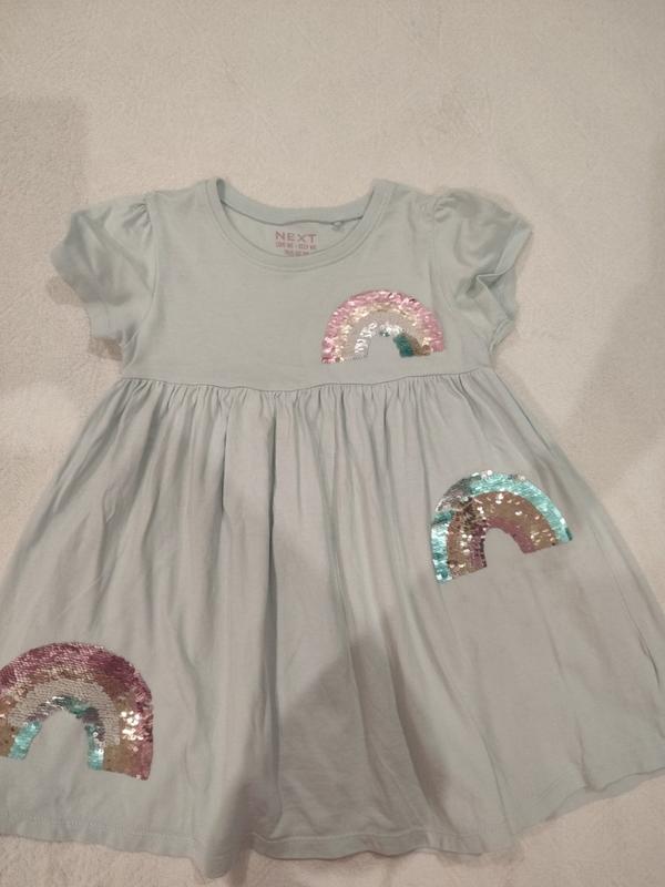 Летнее платье Некст на девочку 3-4 лет (хотя размер указано 4-5 лет, ориентироваться следует на длину). длина от плеча 53 см. Платье нежно голубого цвета с красивыми радугами из лелиток, в идеальном состоянии.