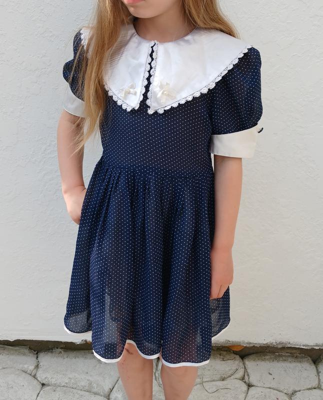 Шифоновое темно синее платье в горошек с воротничком 7-8 лет полупрозрачные, есть подюбник Продаю все по приятной цене. Смотрите мое другое объявления, так выгодно брать несколько вещей. Пересылаю Укр., Новой, Mest по почте, после оплаты, или из-за безопасного оплата на шкафу