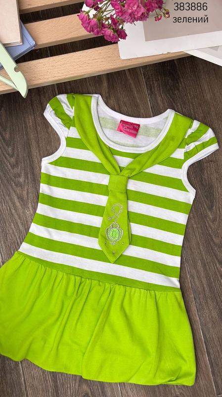 👗 Матеріал: 100% котон (трикотаж) 🌿 Колір: біло-зелена смужка з ніжною декоративною краваткою ✨ Оздоблена блискучою вишивкою та камінцями 👧 Ідеально підходить для садочку, свят або щоденних прогулянок 💨 Легка, приємна до тіла, добре тягнеться 📏 Заміри: Розмір 2: • напівобхват грудей — 24 см • напівобхват талії — 24 см • довжина виробу — 41 см Розмір 4: • напівобхват грудей — 27 см • напівобхват талії — 25 см • довжина виробу — 43 см
