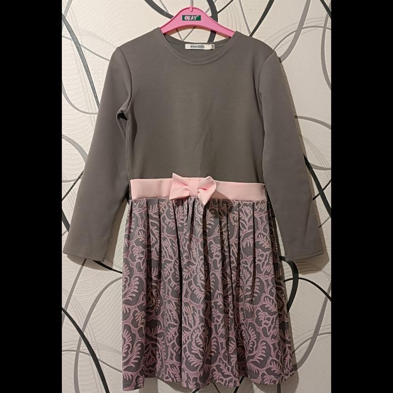 Платье на девочку 8 лет (на бирке размер указан 140), но лучше по замерам ориентироваться. Дефектов нет. Состояние отличное. Замеры: длина -70, пог-34, пот-31, длина рукава -42. Ткань немного тянется.