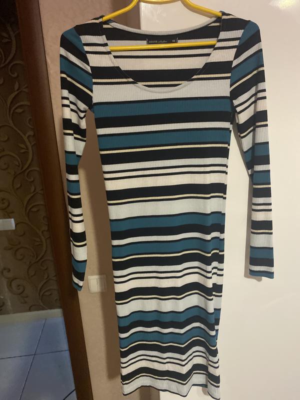 Ця обтисла сукня міді довжини з довгими рукавами має привабливий смугастий візерунок. Смужки різної ширини виконані в гармонійному поєднанні кольорів: чорного, білого, блакитного та темно-бірюзового, що додає динаміки та стильного вигляду. Сукня має округлий виріз горловини і виготовлена з ребристого трикотажу, що підкреслює фігуру. Ідеально підійде для створення повсякденних, але водночас елегантних образів.
