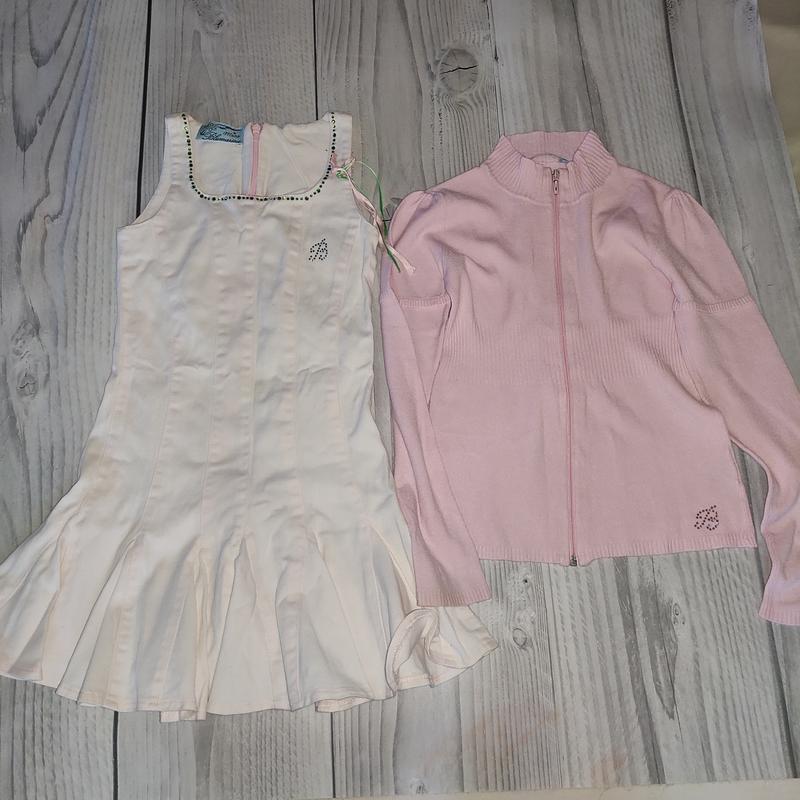 Платье розовое Blumarine слстояние нормальное.ткань как средней плотности джинс.размер 6 лет (116).состав 97 хлопок и 3 эластан.длина 60,в груди 28,талия 26.по спинке молния.если нужна кофта Blumarine тоже 6 лет к платью отдам,но она с нюансами- есть желтые пятышки не отстирались и облезла собачка.состав вискоза по моему. Смотрите другие мои объявления.