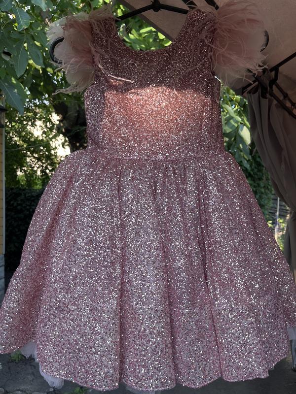 Шикарна святкова сукня на дівчинку, зріст 110, пишна юбка, плечики декоровані пірʼячком, на блискавці, на спинці зйомний бант, одягнена один раз.