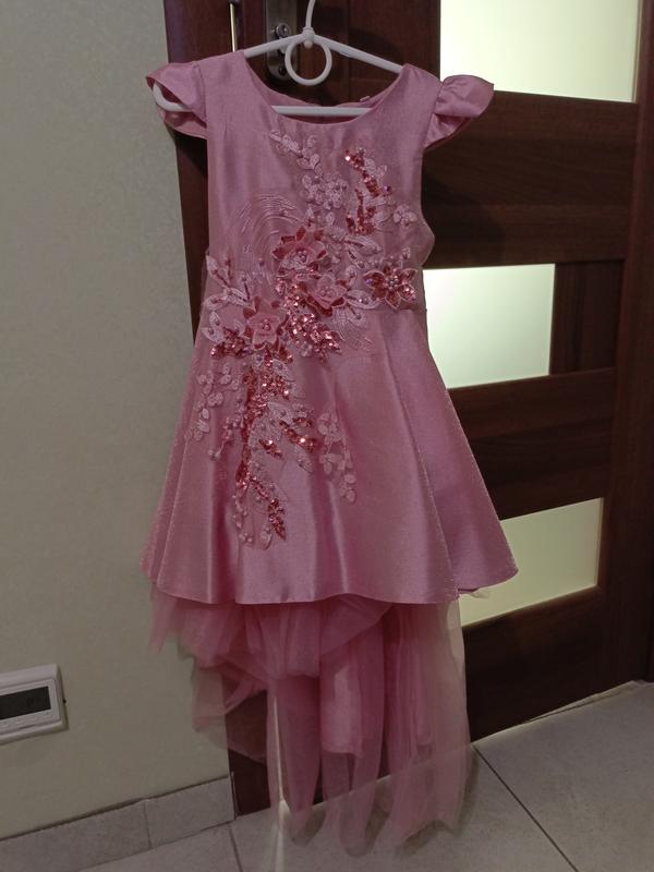 Святкова сукня для дівчинки. Сукня - арочка, спереді коротша, ззаді довша. Фатиновий шар, підкладка На спинці застібка, на талії поясок. Спереді дуже гарне оздоблення вишивкою з паєткою і рожевими перлинами .