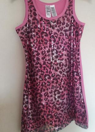 Платье на девочку подростка, или стройную девушку, зависит от роста, примерно на 12-14 лет. ширина под рукавами 40-41 ширина в талии 37-38 у стегнах 47-47 Длина платья 70 см спереди принт пайетками леопард, сзади трикотаж и логотип фирмы вышит люрекосовой нитью. дополнительные фото на запрос.