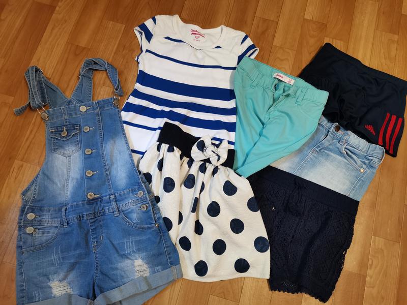 Платье, юбка, брюки. Шорты - юбка адидас, шорты. Джинсовый комбинезон шорты. Вещи пакетом. Состояние хорошее.