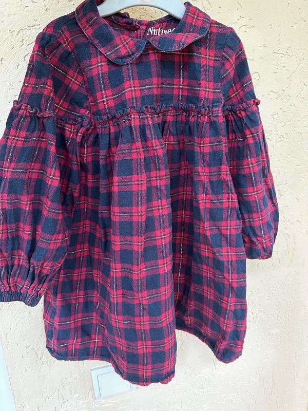 Дуже гарна, баєва сукня. З рукавамм балонами, позаду деревяні гудзики. Золотиста люрексна нитка в тканині.