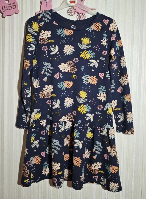 Темно-синее платье с растительным принтом от Cool Club в размере 134. Длинный рукав, состояние идеальное. 100% бавовна. Замеры: длина 70, ширина 35, рукав 48,5. При покупке трех товаров - укрошта в подарок!
