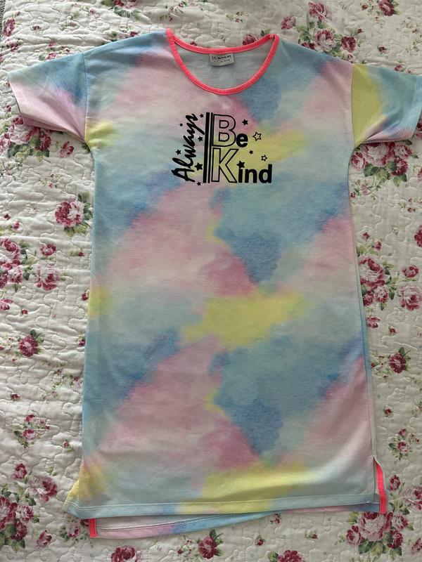 Яскрава та мила сукня з ніжним тай-дай принтом у рожевих, блакитних, жовтих і лавандових відтінках. На грудях напис “Always Be Kind” з зірочками. Круглий виріз оброблений яскраво-рожевою тасьмою. Матеріал приємний до тіла, ідеально підходить для літа або як домашній одяг. Знизу з боків невеликі розрізи з рожевими акцентами.