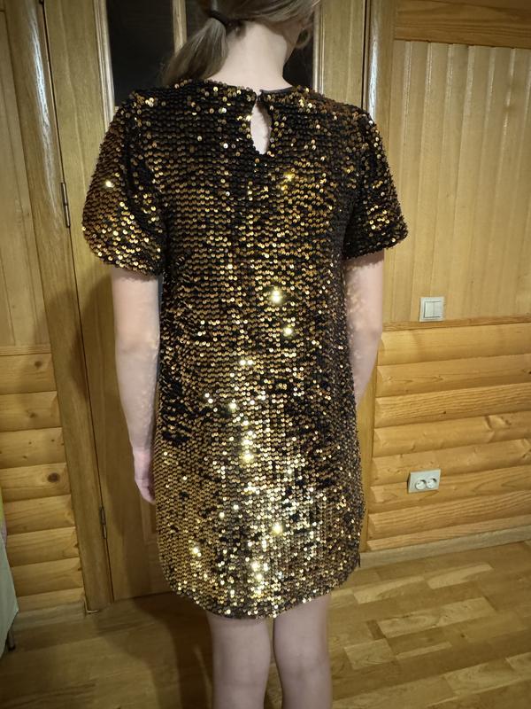 Сукня з золотими паєтками майже нова, одягали двічі, дуже нарядна, дефектів немає. Довжина 76 см, ОГ 80 см. Купували в магазині Zara.