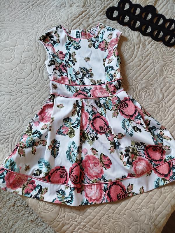 Красивое платье в вышитый принт на возраст 5 / 6 лет, рост по сборке 122 см Качественная плотная ткань Состояние нового, одевалось всего 2 раза