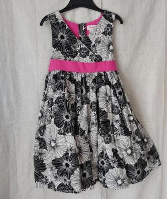 Очень нарядное летнее платьице без рукавов;с отрезной талией; юбка пышная, присборенная;на подкладе, к которому внизу пришита оборка из сеточки, придающая платью ещё большую пышность; ткань белого цвета с чёрным цветочным принтом;по талии пущен поясок яркого цвета фуксии, который завязывается сзади на бант и очень украшает изделие;сзади до талии застёжка из 4 пуговичек; состав волокна верха 100%коттон; американская торговая марка Savannah. Замеры :длина -63, от плеча до талии-20. 5; пог-31;пот-29.5. На девочку 4-5 лет(110см)