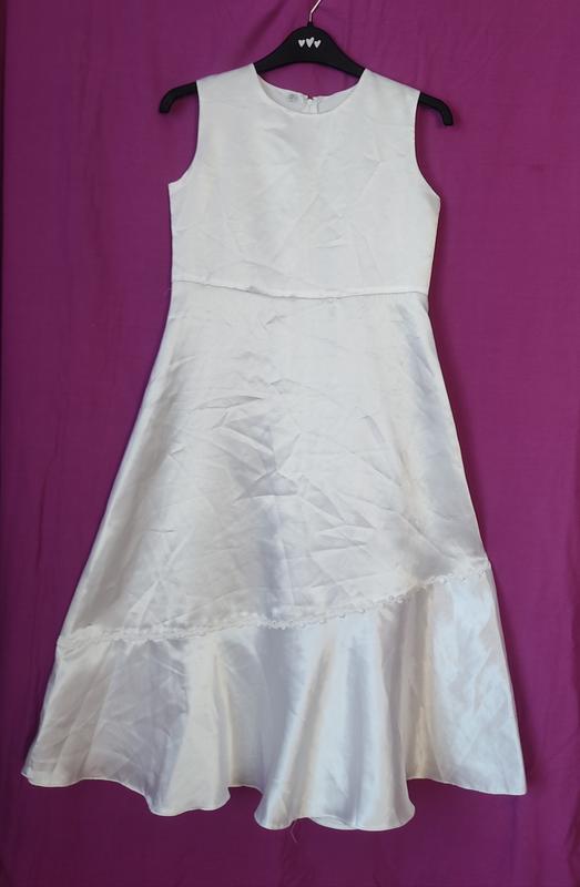 Праздничное длинное атласное платье белого цвета без рукавов; отрезная талия; с асимметричной широкой оборкой и узенькой кружевной окантовкой на месте шва; сзади длинный замочек; на шелковой подкладке; Замеры: длина -104; от плеча до талии-31; пог-40. 5; пот-38. На девочку ростом 134-140 см. Бренда определить не удалось, но согласно внутренней этикетке производство европейское. Идеально для торжественных мероприятий. Без следов ношения.