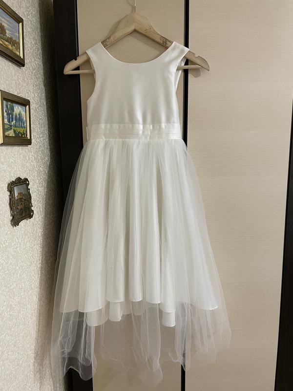 Новое праздничное платье на девочку. На любой праздник, в ресторан, на свадьбу кого-то из родителей, на венчание, на выпускной в садик. Длина платья без учета фатина 75 см, полуобхват гуди 33 см. Цвет - молочно белый.