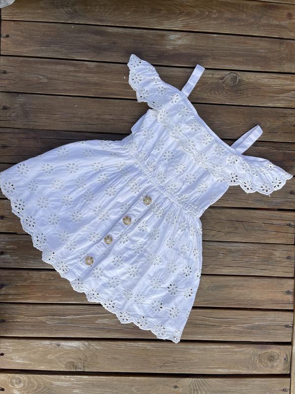 Чудовий літній сарафан з прошви для дівчинки 6-7 років. Спереду прикрашений ґудзиками, плечі відкриті, рукавчики трохи прикривають ручки, дуже гарно виглядає.