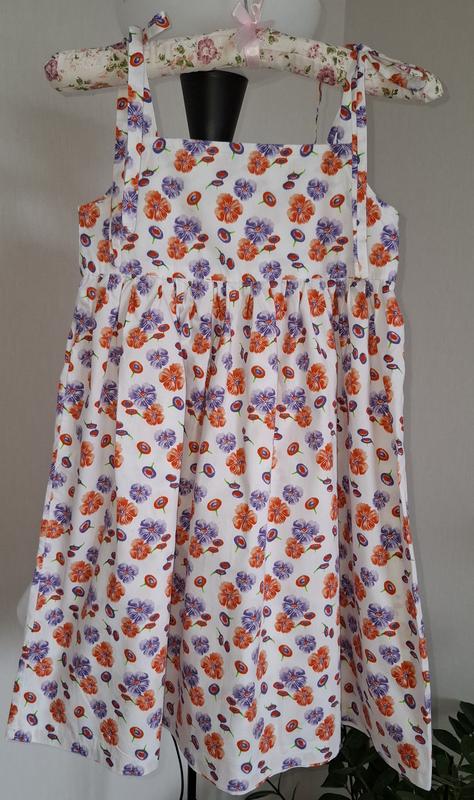 Состояние новой. За счет заязок может регулироваться на разный рост от 116 до 134, 6-9 лет. Ткань натуральная, приятная к телу. Качественный пошив. Очень красивый цветочный принт. Замеры: длина от завязок 67 см ПОГ 34 см