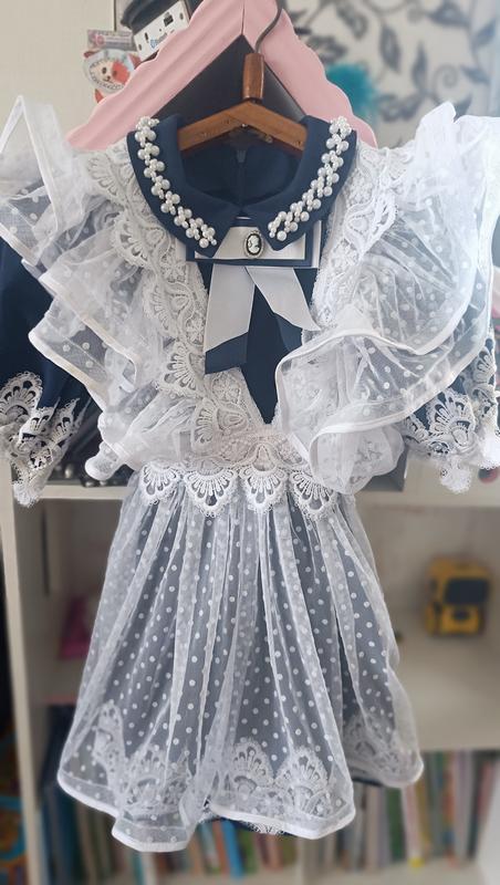 Продам школьное платье синего цвета облитое белым кружевом и на воротничке облитое бусинками+ фартук белого цвета, прикреплен к платью двумя кнопками, чтоб не спадал, шили на заказ, выходило дорого. Смотрелось очень дорого и празднично. Состояние отличное. сделано в Украине