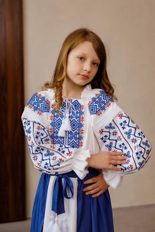 Вышитое платье для девочки Боодара (белое с синим) выполнено на натуральной ткани. Тип вышивки-крестик размер 116 122 128 134 140 мод.бар