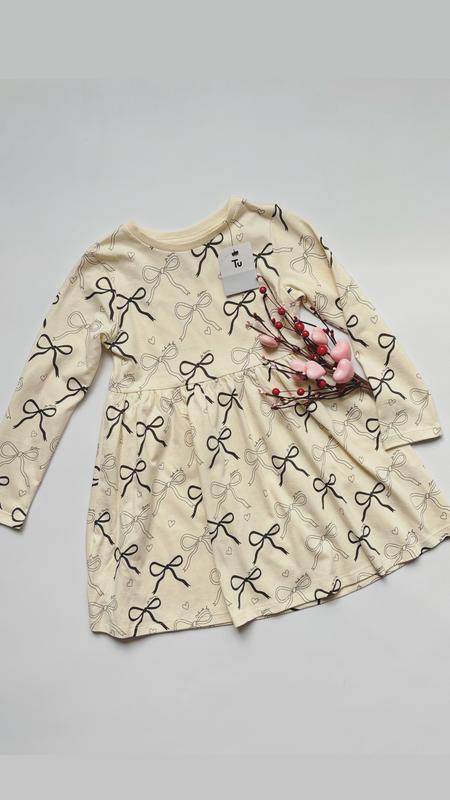 Бавовняна сукня від бренду TU у ніжному кремовому відтінку з милим принтом бантиків та сердечок. М’яка, приємна до тіла та зручна. Ідеальний вибір для садочку, прогулянок чи святкових моментів. Тканина: 100% бавовна
